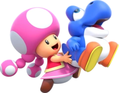 Toadette holding a blue Baby Yoshi in New Super Mario Bros. U.