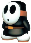 Black Shy Guys are a species of Shy Guy that appear in Yoshi's Story. They carry an anvil that drops when a Yoshi is near. When a Yoshi eats a Black Shy Guy, the Yoshi loses three petals from the Smile Meter. These Shy Guys first appear on Stage 3-3, Poochy and Nippy. White and Black Yoshi can eat them.